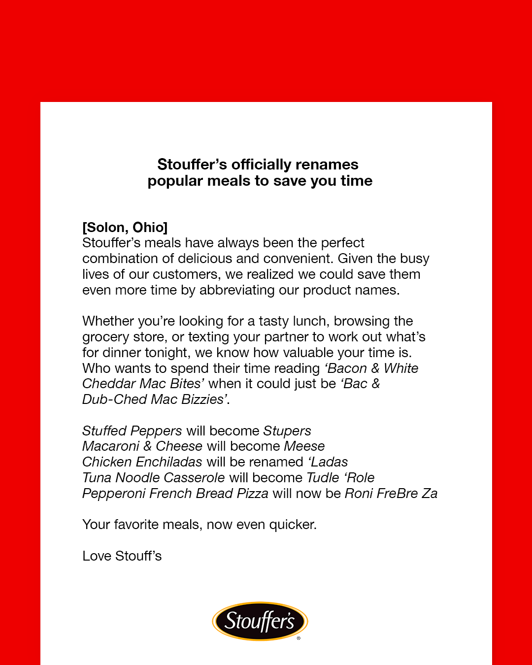 so, we shortened the names of stouffer’s products, and even abbreviated the brand name, to establish the brand as king of convenience.